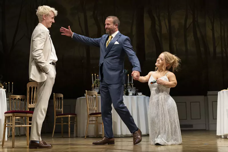 Recently appointed deputy artistic director at the National Theatre, Hastie (former artistic director of Sheffield Theatres and responsible for the wonderful Standing at the Sky’s Edge) makes a clever start as he has court retainers see the ghost of Old Hamlet (Ryan Ellsworth) not on the castle ramparts but in a banqueting chamber across the famously wide Lyttelton stage. Costume design by Ben Stones has Ellsworth as a red-bereted paratrooper. Stones, who emerges with credit from this, is also the set designer and the backcloth created by Daniel Radley-Bennett features trees that you fancy Ellsworth would have parachuted into during the civil war that has been raging in Denmark. So much, so innovative and logical. And yet from here on in, what a falling-off was there!