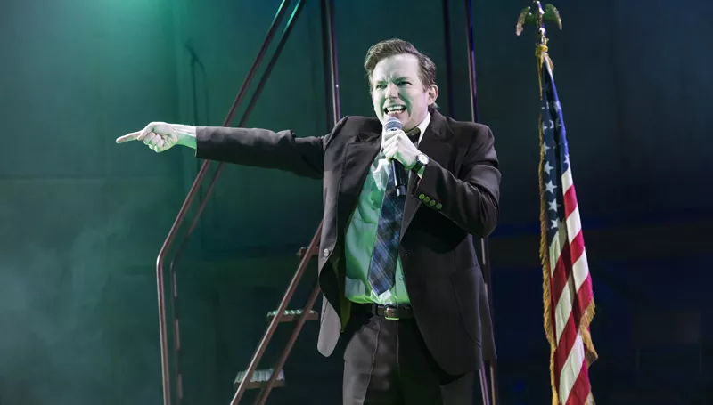 Holden’s transformations are so quick and precise he could probably impersonate the entire front row before the interval. One moment he’s Kenrex, all swagger and predation. The next he’s a witness, a frightened neighbour, or a prosecutor exhausted by the legal system’s inability to handle someone with McElroy’s unique blend of greed, brutality, and stupidity. And it’s not just monologues: often, Holden plays out both (or, in one case, all three) sides of a conversation with little more than changes in voice and stance.