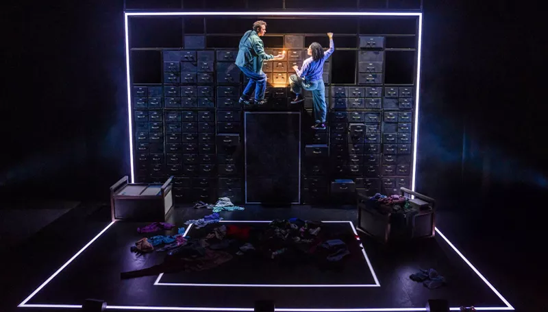 There are remarkable similarities with Luke Norris’s play Guess How Much I Love You?, currently playing at the Royal Court, which also has a cast of two, and concerns a relationship beset by pregnancy trauma. However, under Graham’s direction the style of Lost Atoms is very different. Layton and Sinclair Robinson use Andrezj Goulding’s set – a bank of filing cabinets – like a climbing wall. Drawers pull out to become seats, steps, even a toilet, but they also act as drawers, containing props and also memories. A massive slab, looking disturbingly like the door to an ancient tomb, flips up to form a bed, angling the couple towards the audience in mid-air.