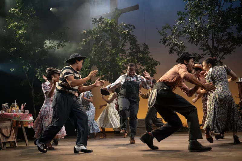 The Rep production took a good long while to put together. The manuscript included song titles but no music, sometimes not even lyrics, sometimes just a notation, “They sing a song here”. Nehemiah Luckett, music supervisor on the production, found most of the songs Hurston called for and wrote a few new ones when this proved impossible. The result is a disarming mixture of work songs, prison songs, folk, gospel and blues beautifully performed by the 15-member cast.