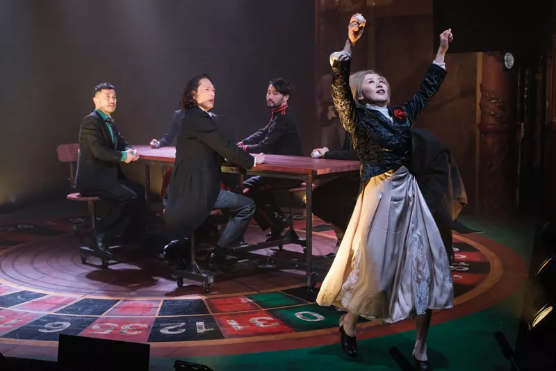 Director Motoi Miura begins the evening with gorgeous incidental stride piano. As somebody who does occasionally go to casinos, if only as a hanger-on, the set design by Itaru Sugiyama – even if broad brush – made me feel I was indeed watching a gaming room right down to all the nervous tics, superstitions, and stylized movements of those at the table. Yasuhiro Fujiwara’s lighting design illuminates red and white vertical strands above the stage that reinforce the idea of roulette, and Sugiyama sketches the betting pockets of the wheel on the stage floor.