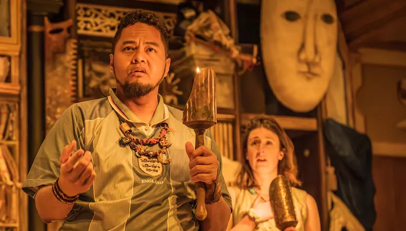 Crouch’s unusual approach not only offers a new way of looking at the play as a whole, but also provides many insights and delights along the way. In limiting Prospero’s power, Miranda, Ariel, and Caliban all gain greater individual agency. Miranda (Sophie Steer) is gauche but forthright. Ariel (Naomi Wirthner) is caring, even maternal, returning in quieter moments to her knitting. Caliban (Faizal Abdullah) often asserts his dignity, as when he chooses to speak in Singaporean Malay.