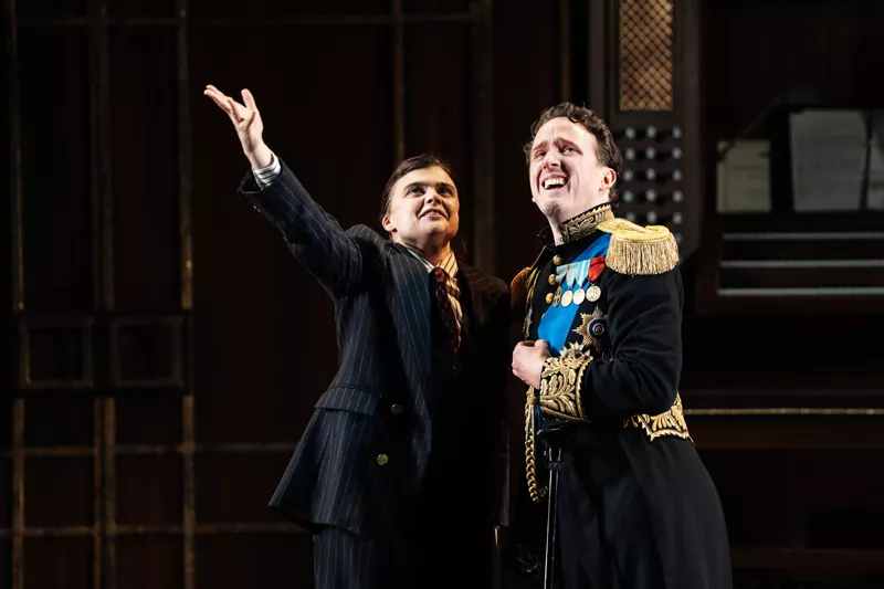 The presiding presence in this production is that of Feste, the jester who roams between the households of Count Orsino and Lady Olivia, the two most socially prominent figures in Illyria. As played by the engaging and energetic Michael Grady-Hall, he is no longer the shadowy soul that he so often seems in presentations of the play. Rather, he is robust and irrepressible and, partly through extended comic business that is not always linked to the plot, he often steals the show. Indeed, he makes his first appearance singing a song while being lowered from above on a wire, and sporting a distinctive shock of hair that marks him out as being halfway between Stan Laurel and Morrissey. This seems fitting, as the refined score has been composed by Matt Maltese, who, known for his mournful and dramatic indie love songs, has been compared to the lead singer of The Smiths.