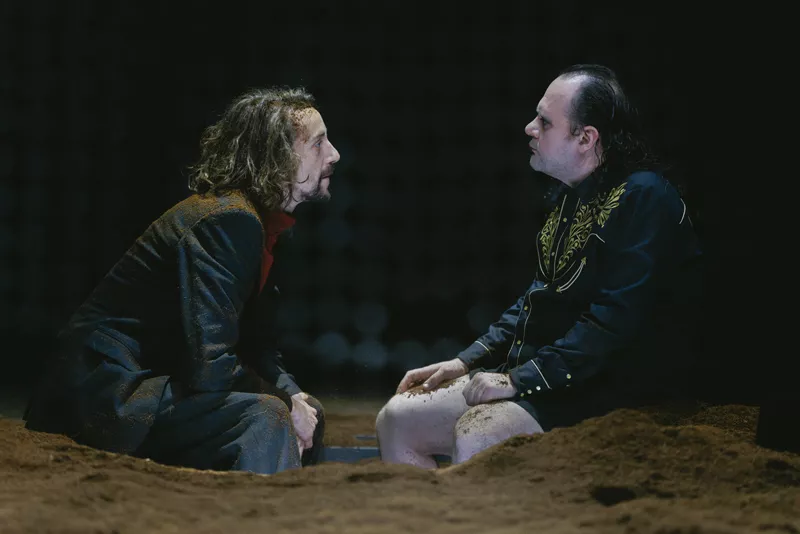 The curtain opens, and we see a refrigerator which functions as a safe – during the war in Ukraine, you have to hide your valuables, and the fridge is their hiding place; it contains books by Joseph Roth. A looming rectangle is open on stage; it is a grave site. Kyrylova, the shouting emcee woman (so tall, so spindly; is she really a woman, has she been a woman her whole life long?) is next to the grave site. Now she is a gravedigger. Earth is dug out and flung about, not energetically. We are enveloped in a whirl of gestures and languages thrown at us like mudballs (with surtitles for the needy): German, Ukrainian, Bulgarian. Occasionally, English. Why Bulgarian? Because there is also now a gravedigger, an energetic man, the actor Samouil Stoyanov, and he is Bulgarian. Kyrylova is a Ukrainian actress, and she understands Bulgarian it seems, for the two gravediggers shout and reply each in their own language. They exchange angry words. Half the audience understands Ukrainian. The remainder understand German. They can read the Bulgarian surtitles. Different sections of the audience burst into laughter at different times, like a peeled orange sectioned into two halves.